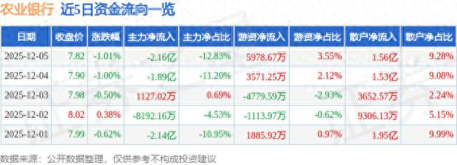 12月5日农业银行股价下挫1.01%,主力资金大幅撤离2.16亿元,这场资本博弈背后暗藏玄机。